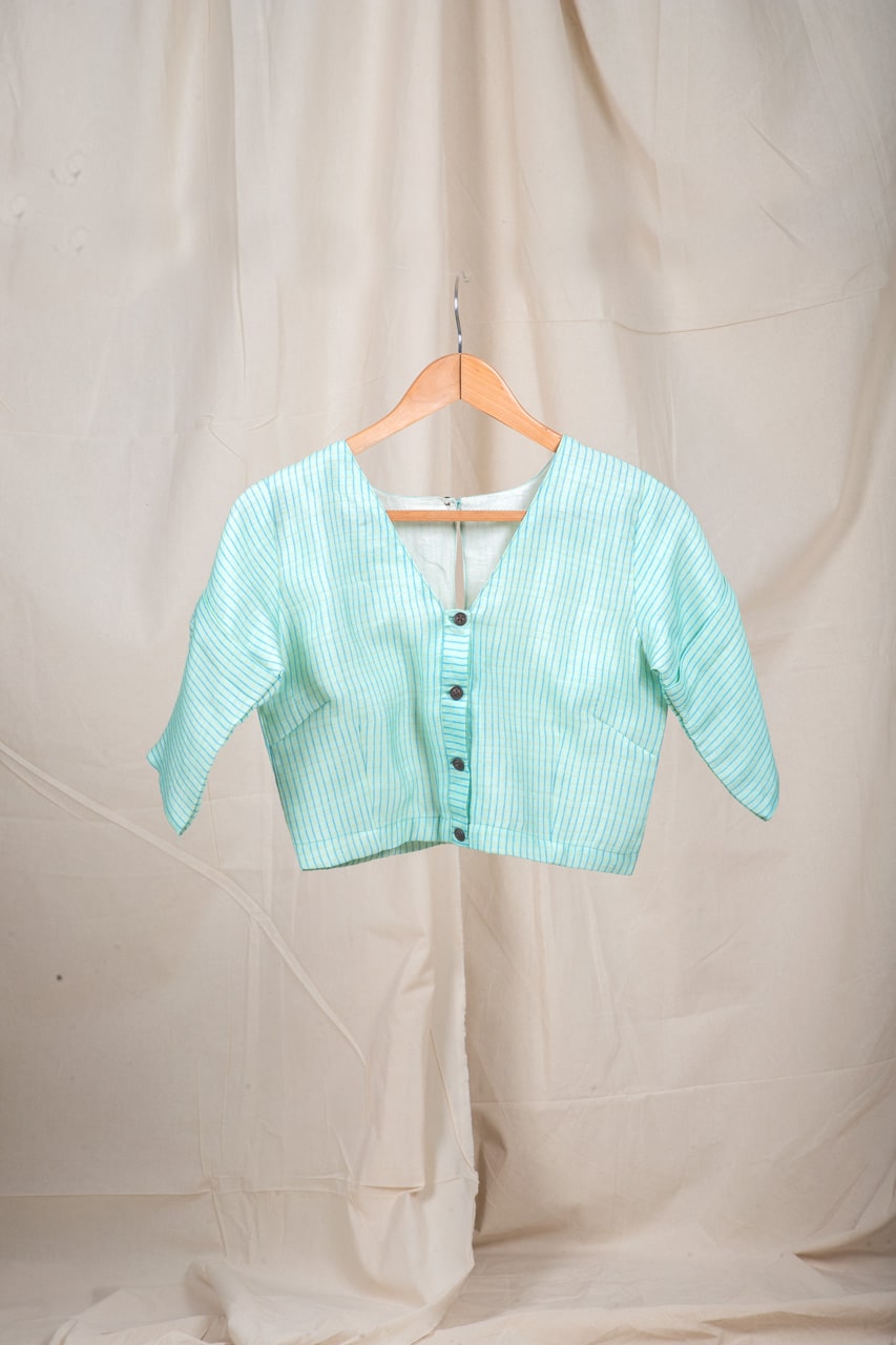 This one is too stylish and pretty, the neck as V pattern,it's a front open blouse with wooden buttons.The blouse has vertical stripes and the sleeves have slight patterns.