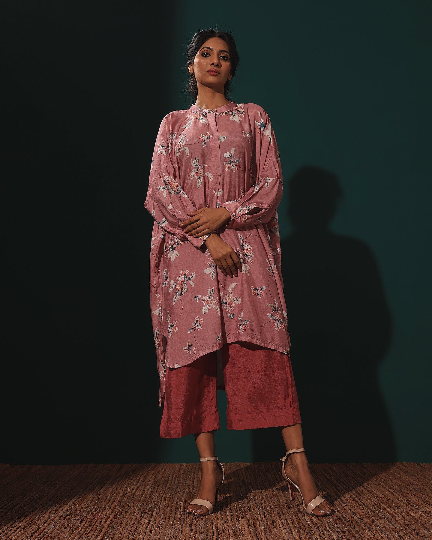 "In silk cotton's embrace, a loose kurta flows, Floral motifs in bloom, a sight that glows."