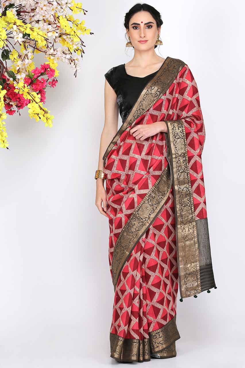In an absolute stunner of shade, this strawberry pink Moonga Silk saree surely catches the eyeballs amid all the worldly distractions. Coupled with crisscross line patterns and dual-color shades along with metallic grey weaved zari border along the edges, this surely stands out amongst all other works of Benarasi Handloom.