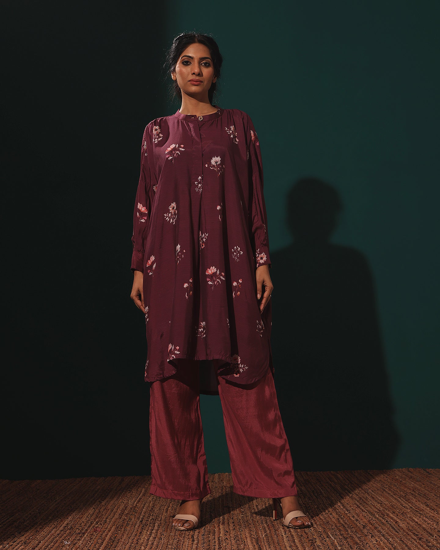 "Elegant ensemble, a silhouette to bet.Burgundy floral kurta set, loose and free, "
